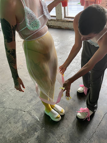 En explorant la complexité de la personnalité, sa marque reflète comment les intérêts contrastés en chacun peuvent évoluer vers ce monde FEVER-DREAM-CORE. Ce magnifique chaos trouve son expression dans les pièces colorées du créateur, riches en rubans, volants et paillettes, qui coexistent avec des éléments contrastés, des pics, des bords bruts et des textures cauchemardesques, souvent rendus dans de grandes proportions sculpturales qui dépassent la forme du corps.